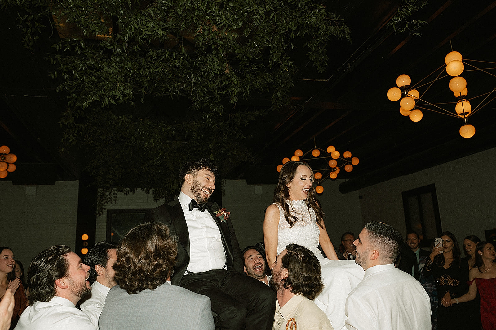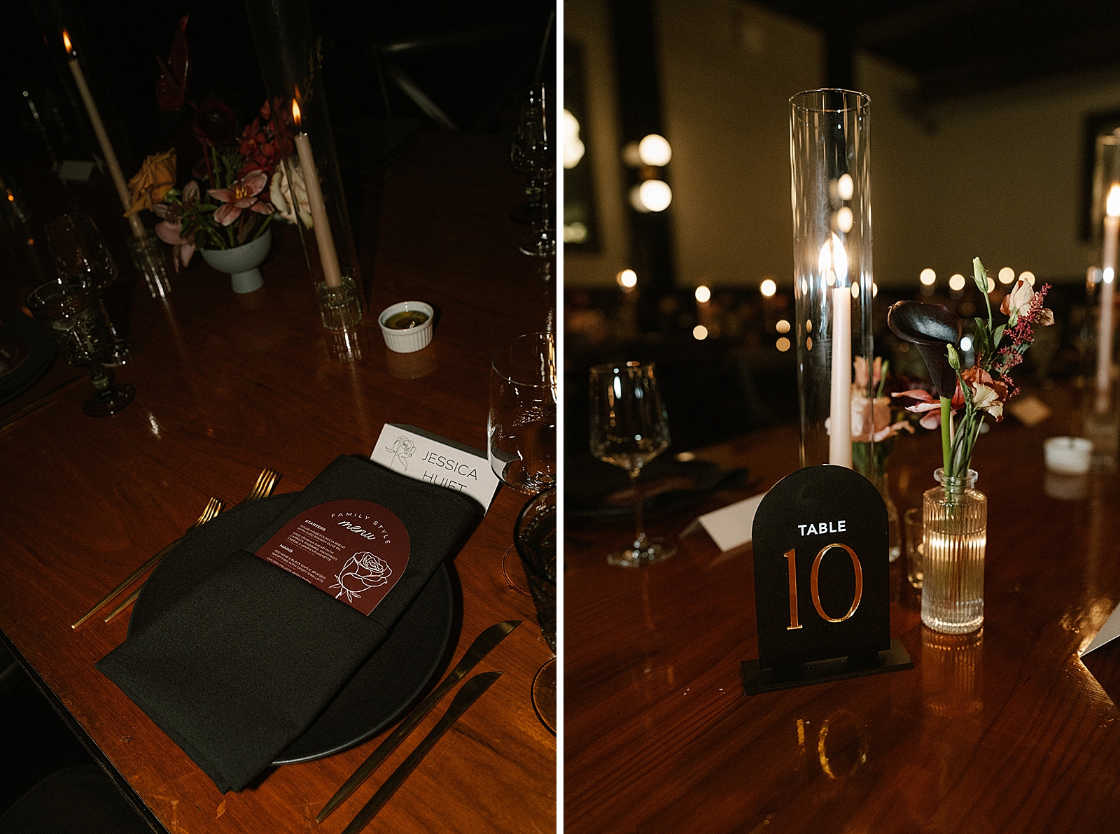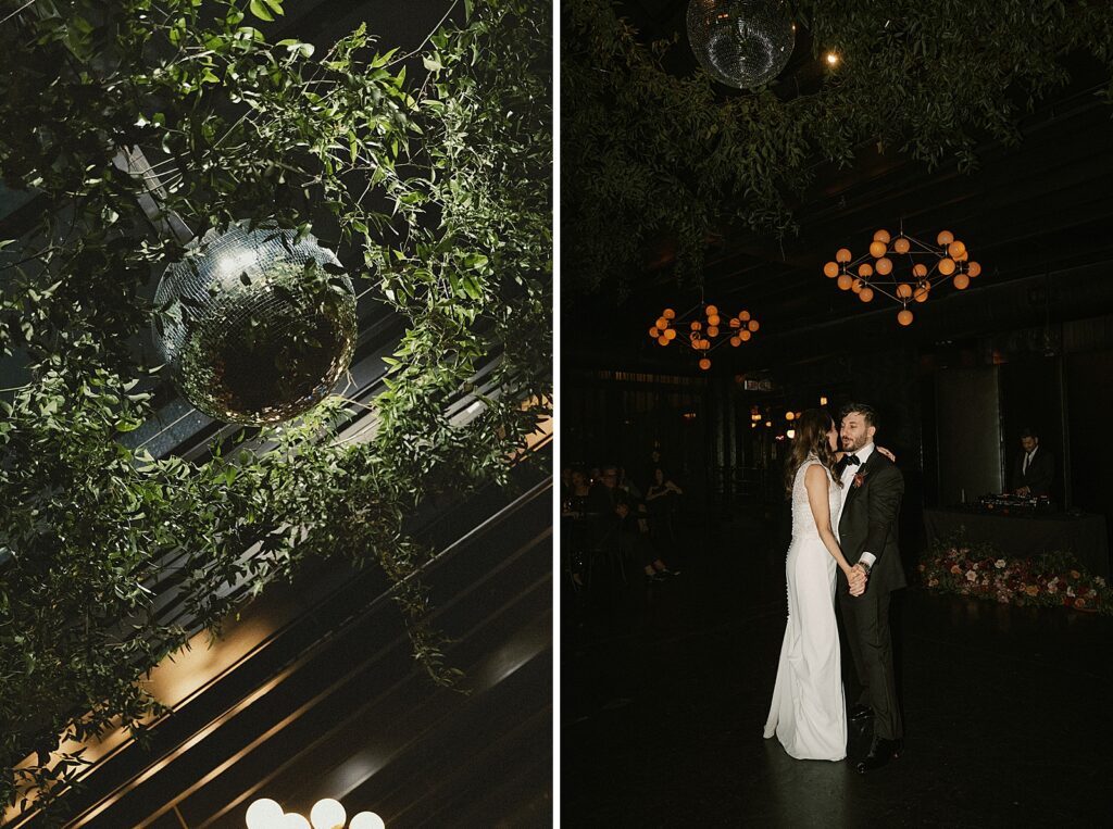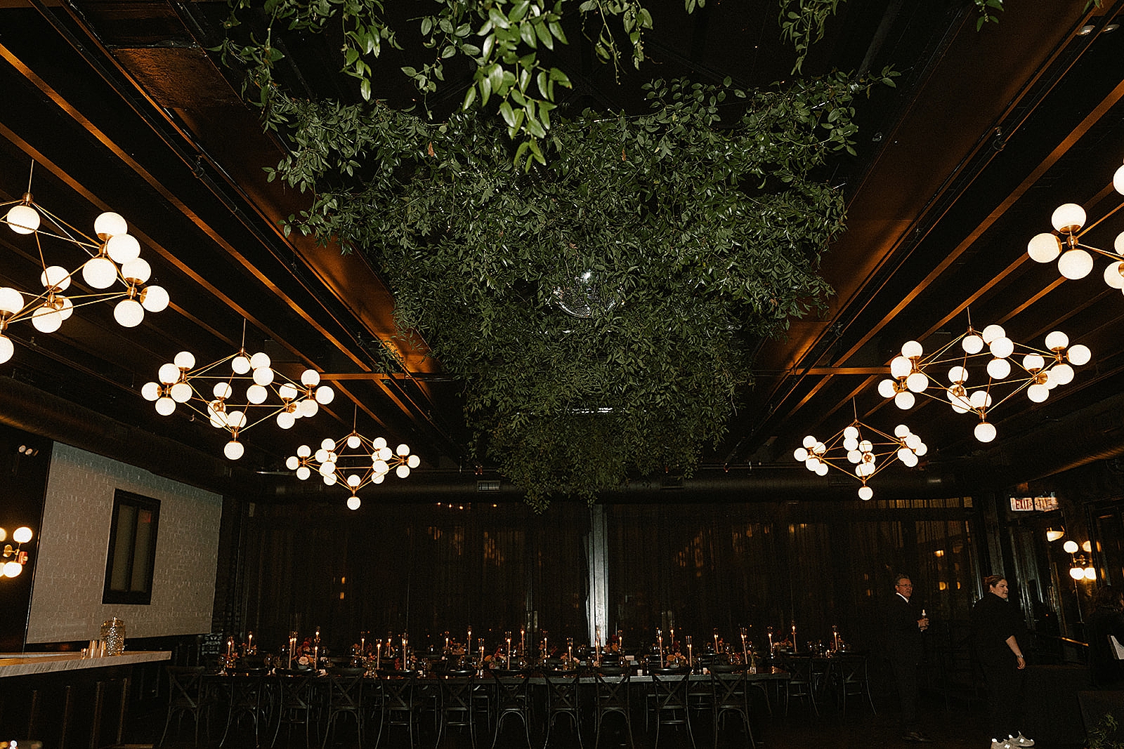 Olivia of Olivia Howard Designs created a gorgeous floral design that brought all of these elements together and also tied in the natural beauty of the space. I absolutely loved the greenery installation we crafted on the skylight above the dance floor. The way the disco ball shined through the leaves was stunning! Jenna created their paper goods that carried from invitations all the way through menus and bar signs.