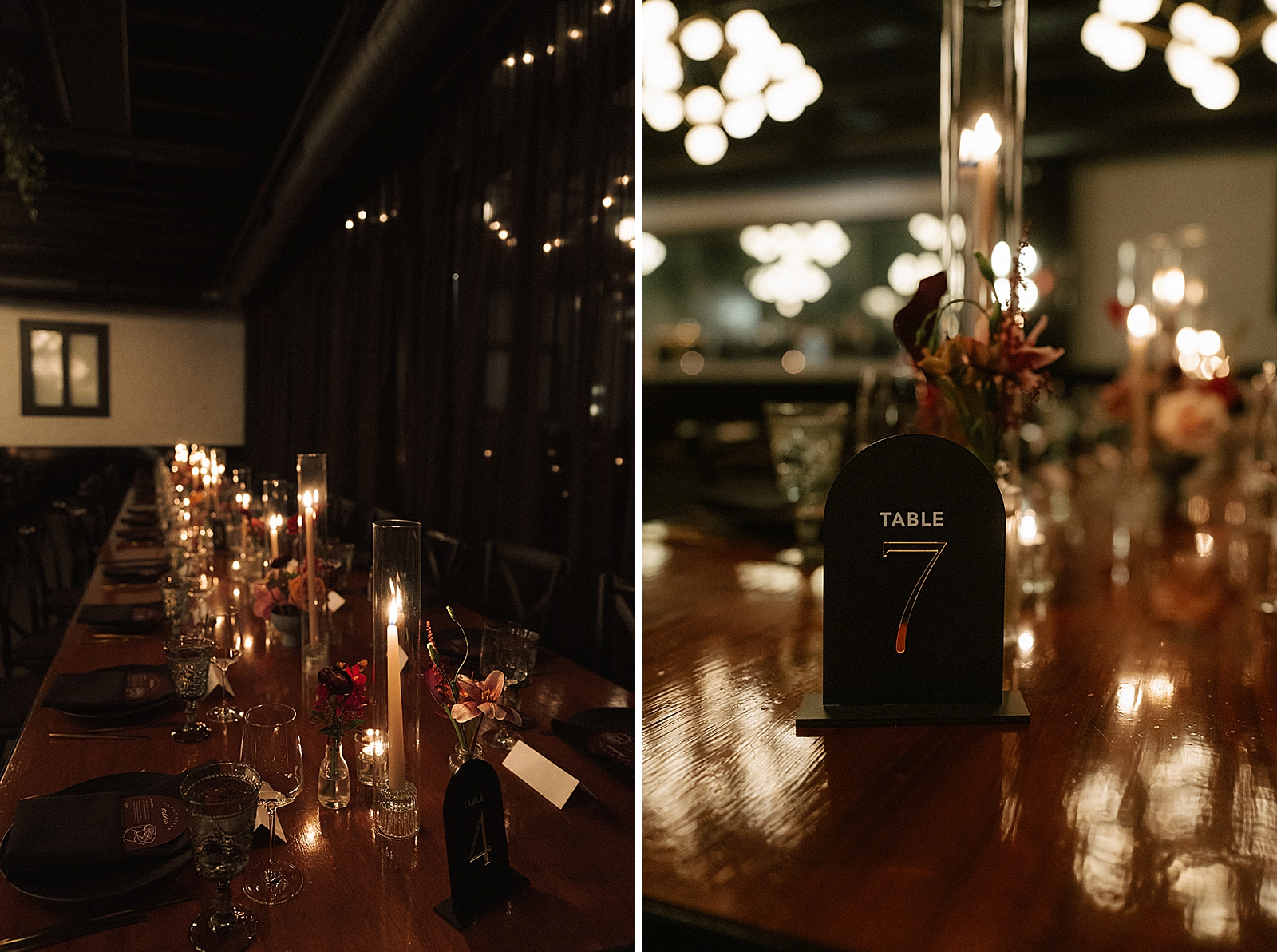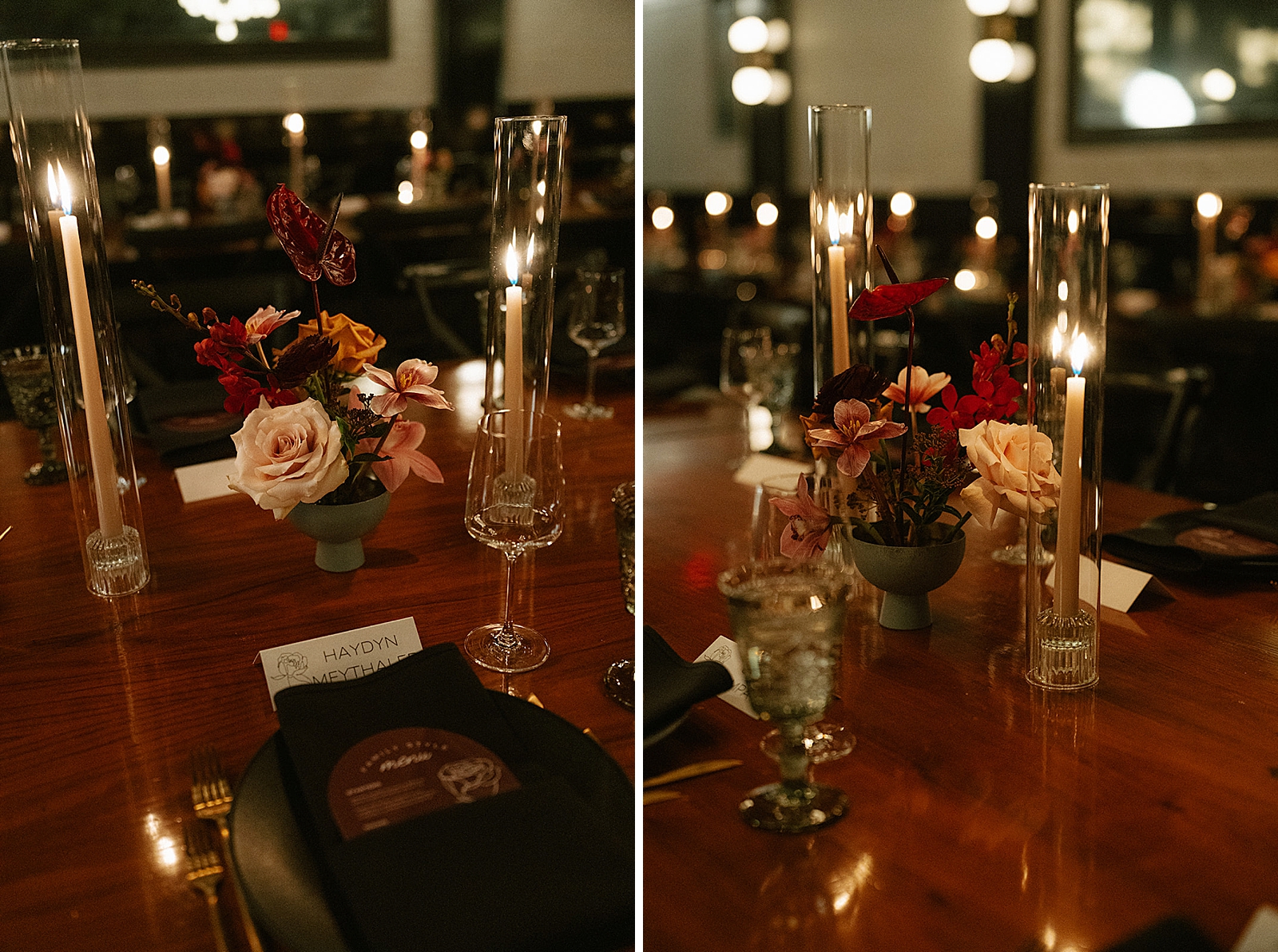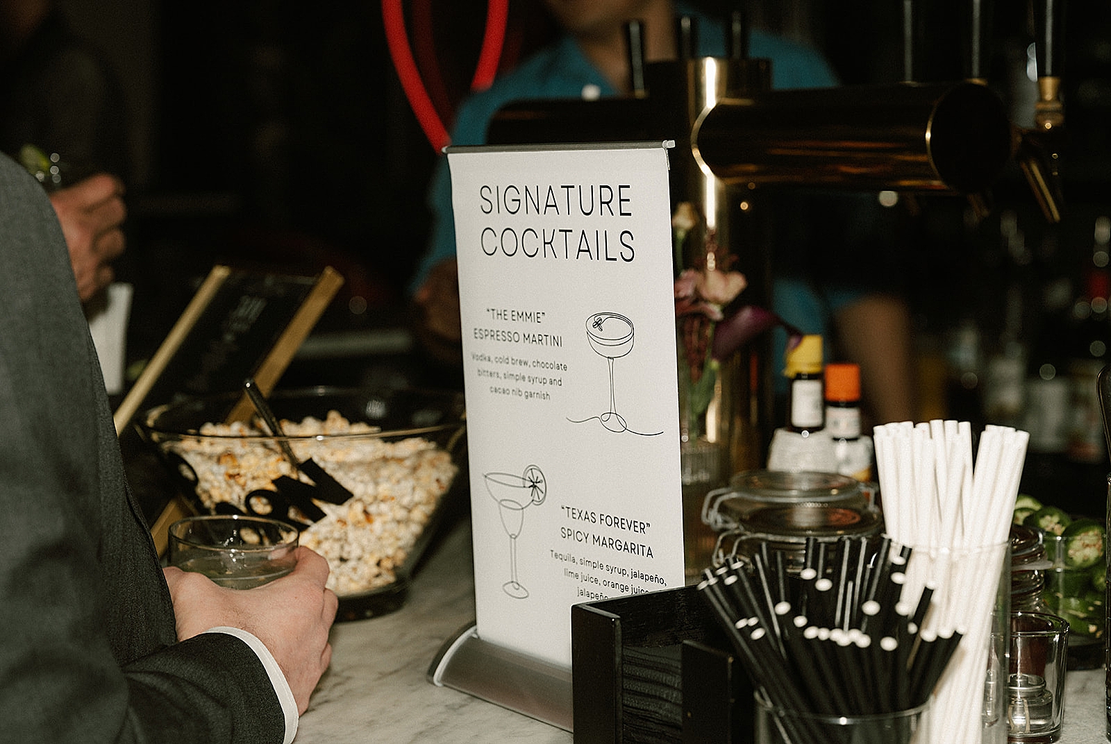 Olivia of Olivia Howard Designs created a gorgeous floral design that brought all of these elements together and also tied in the natural beauty of the space. I absolutely loved the greenery installation we crafted on the skylight above the dance floor. The way the disco ball shined through the leaves was stunning! Jenna created their paper goods that carried from invitations all the way through menus and bar signs.